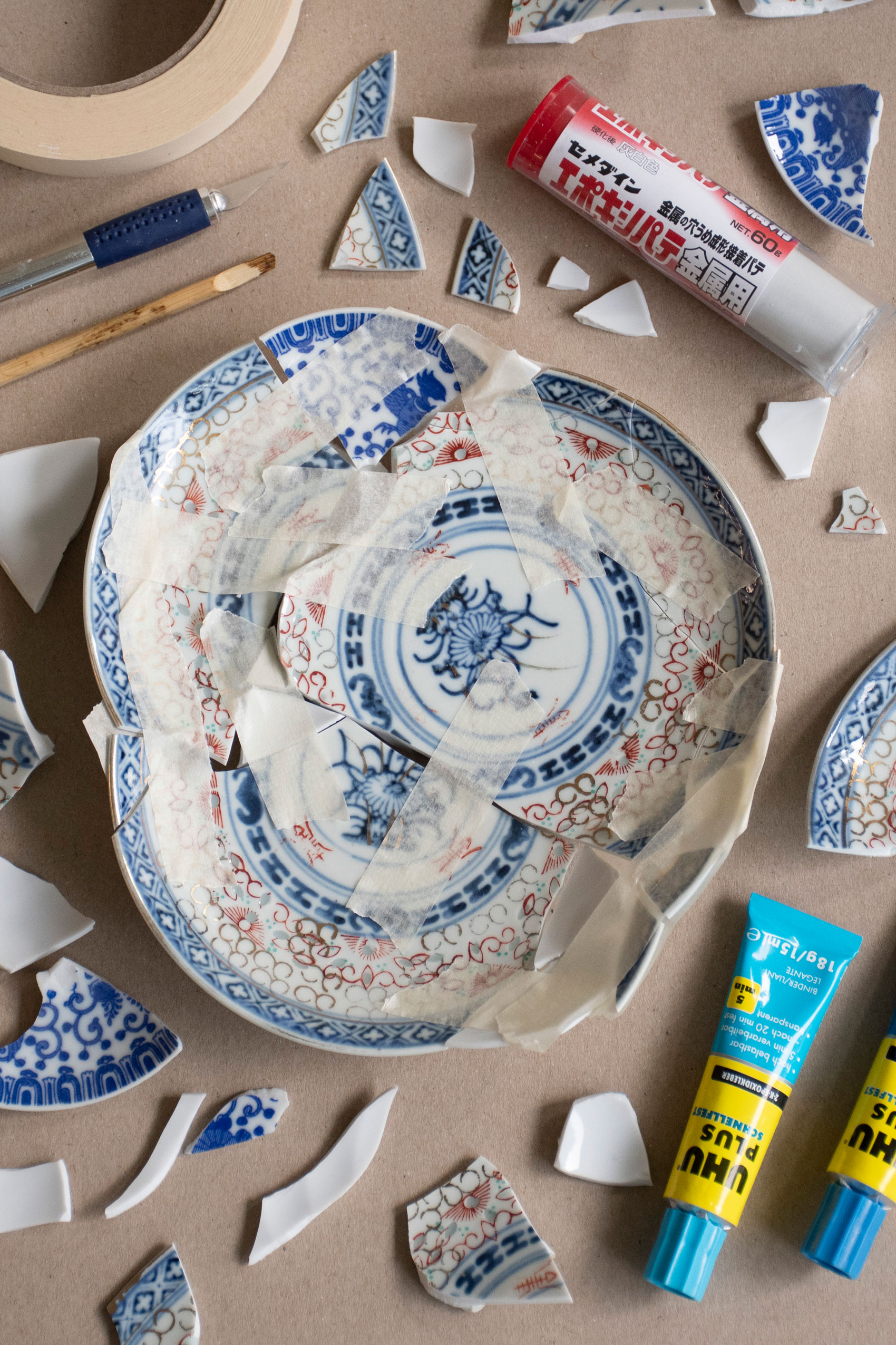 Je suis allée chiner des pièces au Galetas (brocante de Montreux) dans l’optique de les casser et de les recomposer. Pour une question de temps, j’ai utilisé une colle synthétique pour l’assemblage, puis la méthode traditionnelle de réparation pour finaliser les pièces.