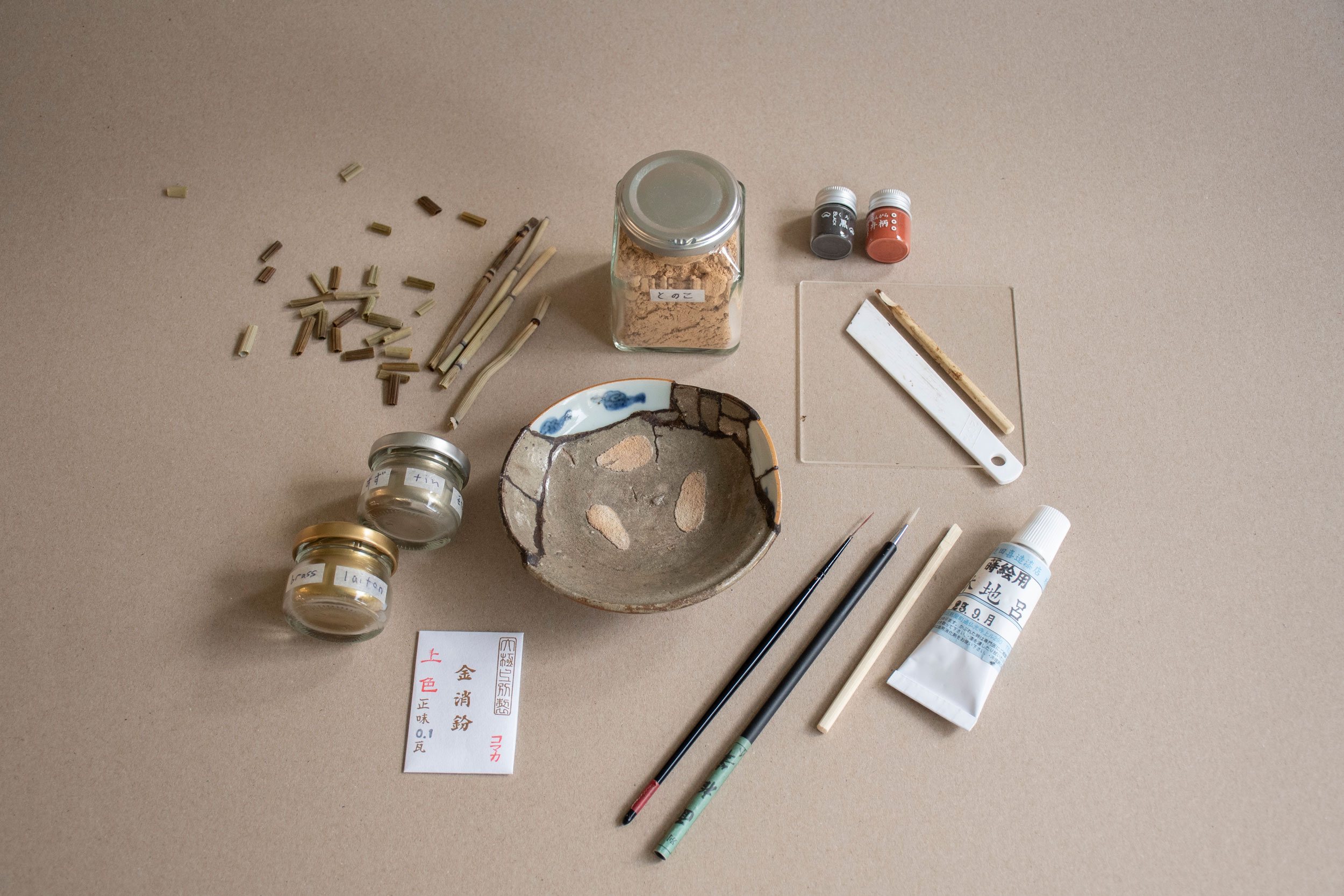 Matériel de réparation kintsugi décomposé